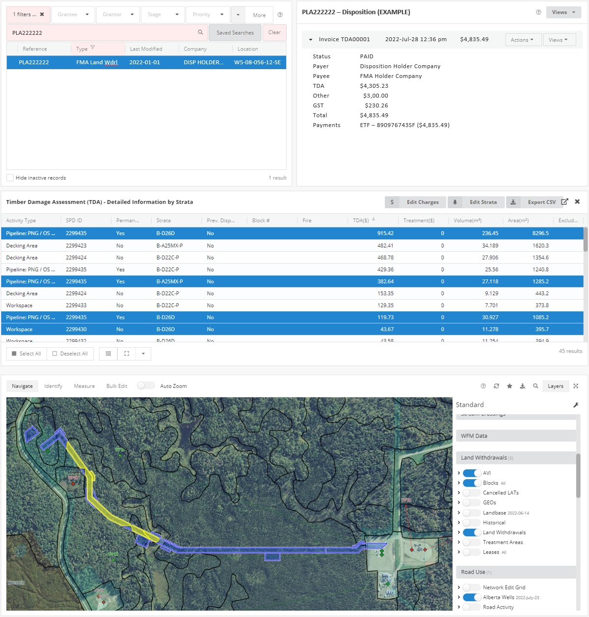 - The system automatically geoprocesses the grantee’s activity and identifies all the potential dispositions that are impacted by it (road use, crossing, encroachment, ground disturbance, etc.). Each of these impacts are manually reviewed and confirmed and approved, or deemed not required.