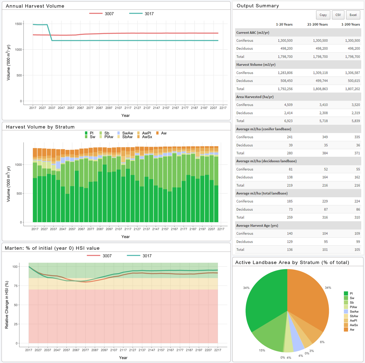 The Scenarios module is a custom-designed online platform developed by Forcorp and used to organize and present scenario modelling outputs for timber supply analysis, ecological value assessments, caribou habitat, and more.