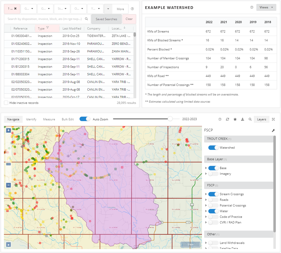 The Stream Crossings module was designed to meet environmental stewardship and safety requirements, which are a shared responsibility of industry and government. The Stream Crossings module allows members of the Foothills Stream Crossing Partnership (FSCP) to create, view, and download crossing inspection and watershed remediation reports, derived from field data collected and loaded to the system from mobile devices.